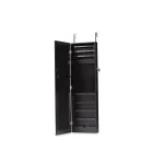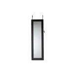 Mirrored glass front Constructed from engineered wood Your choice: hang over the door, or mount on the wall Hanging/mounting hardware included Capacity: 16 necklace and bracelet hooks, 45 earring holders, and one hanger rod Assembly required